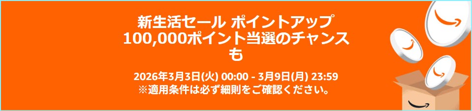 Amazon 新生活セール」では最大10万ポイントが当たるキャンペーンを開催。