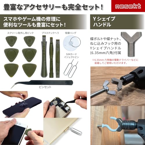 | 梱包種類 | 合計 135個セット 115ビット、延長シャフト、フレキシブルシャフト、ピンセット、SIM取り出しピン、 スクリーン分離ピック3種類×2、マグネタイザー(磁力回復)吸着カップ、電動ドリル用ホルダー、ケースオープナー×3 pocket wrench Y-shape ハンドル |